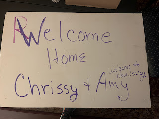 When we finally arrived at Chrissy's parents' house, we were greeted by them and her sister waiting for us on their front porch holding a welcome home/to New Jersey sign. It was super sweet of them!